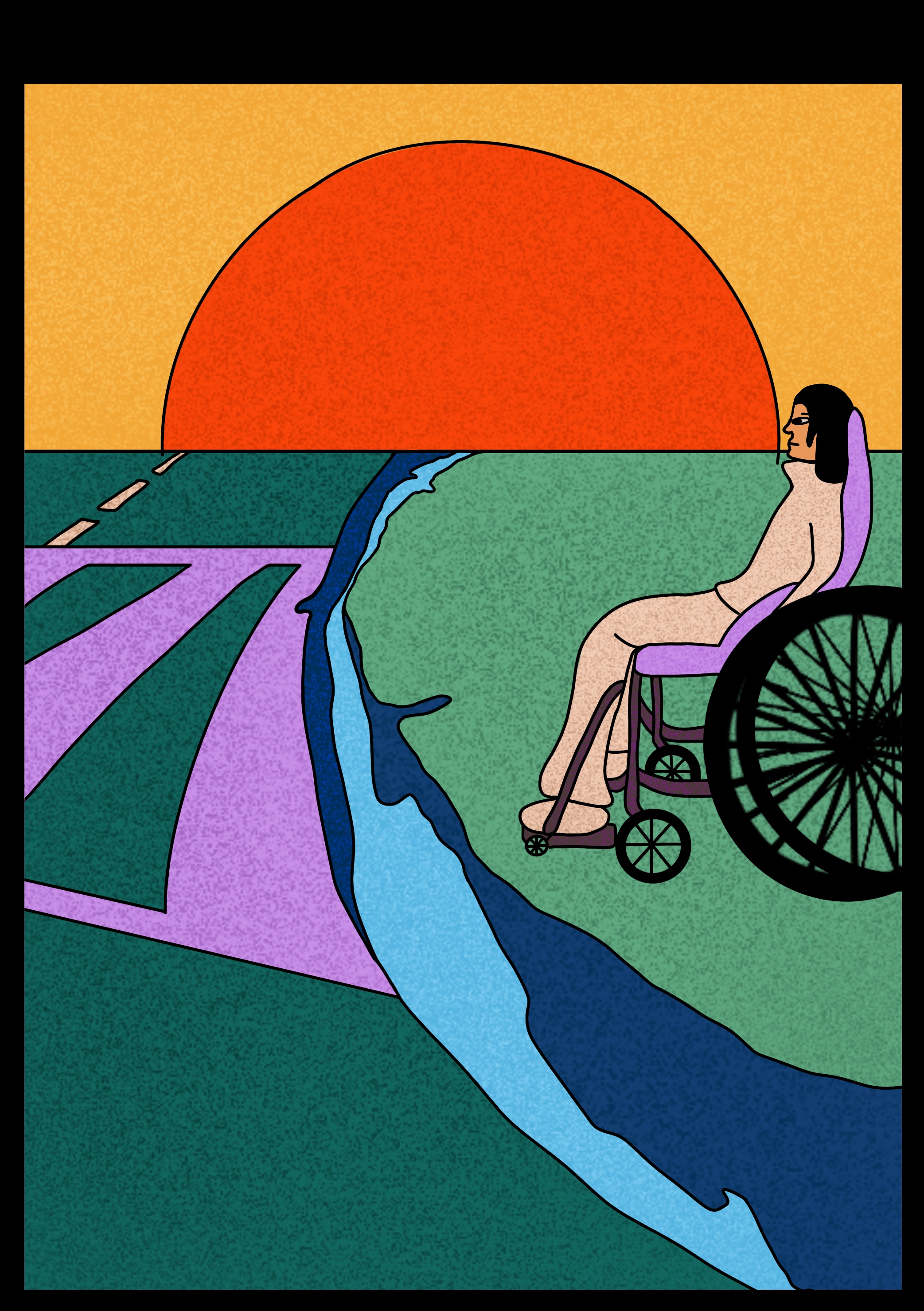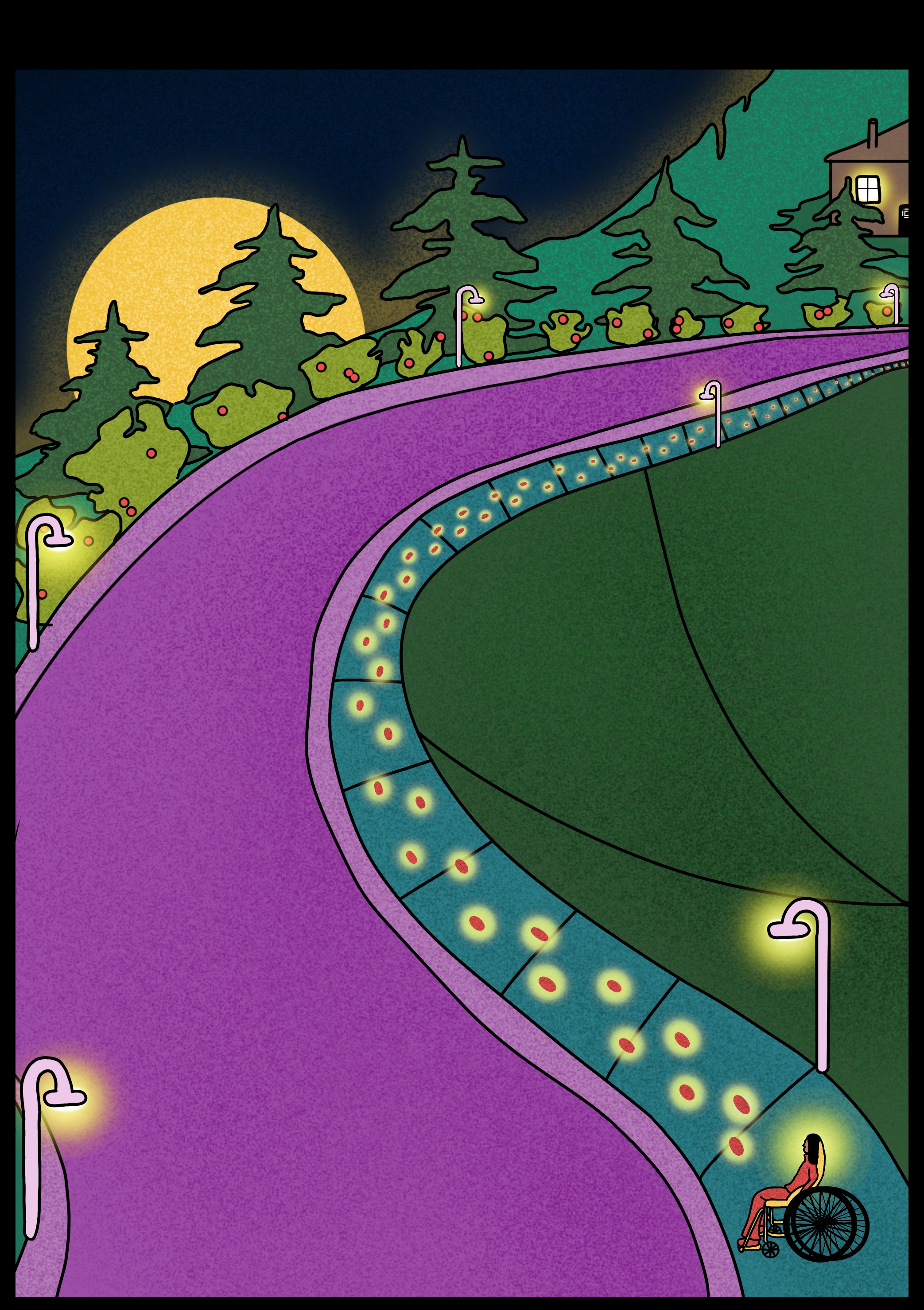 Tatiana mentioned that illustrator Maria Medem’s style inspired these posters. You can see the reflections of Medem’s work in relationship with Tatiana’s own style and the clear portrayals of Kelowna landscapes. Tatiana developed criteria to determine the accessibility of different spaces around Kelowna. As she walked around Kelowna, she took notice of the places that she felt were particularly inaccessible to replicate in her posters. This project asked that she think differently about the spaces she interacted with often as an able-bodied person. Tatiana noted that many spaces seem accessible in theory, but they do not consider how real-life variables, like the weather, drastically change this accessibility.