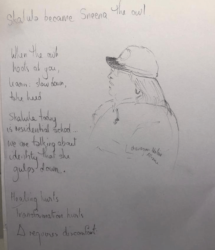 As a Syilx/Okanagan woman and a member of the Westbank First Nation, Coralee Miller works as a guide at the Sncewips Heritage Museum, where she is able to further her passion for storytelling, culture and art. Coralee was also part of part of the convening committee of our Fire + Water event, which took place at Woodhaven on May 13. Coralee led a sketchbook journaling workshop as part of this gathering, and shared knowledge about syilx fishing technologies and other stories. We caught up with Coralee recently and asked her to tell us more about her passions: