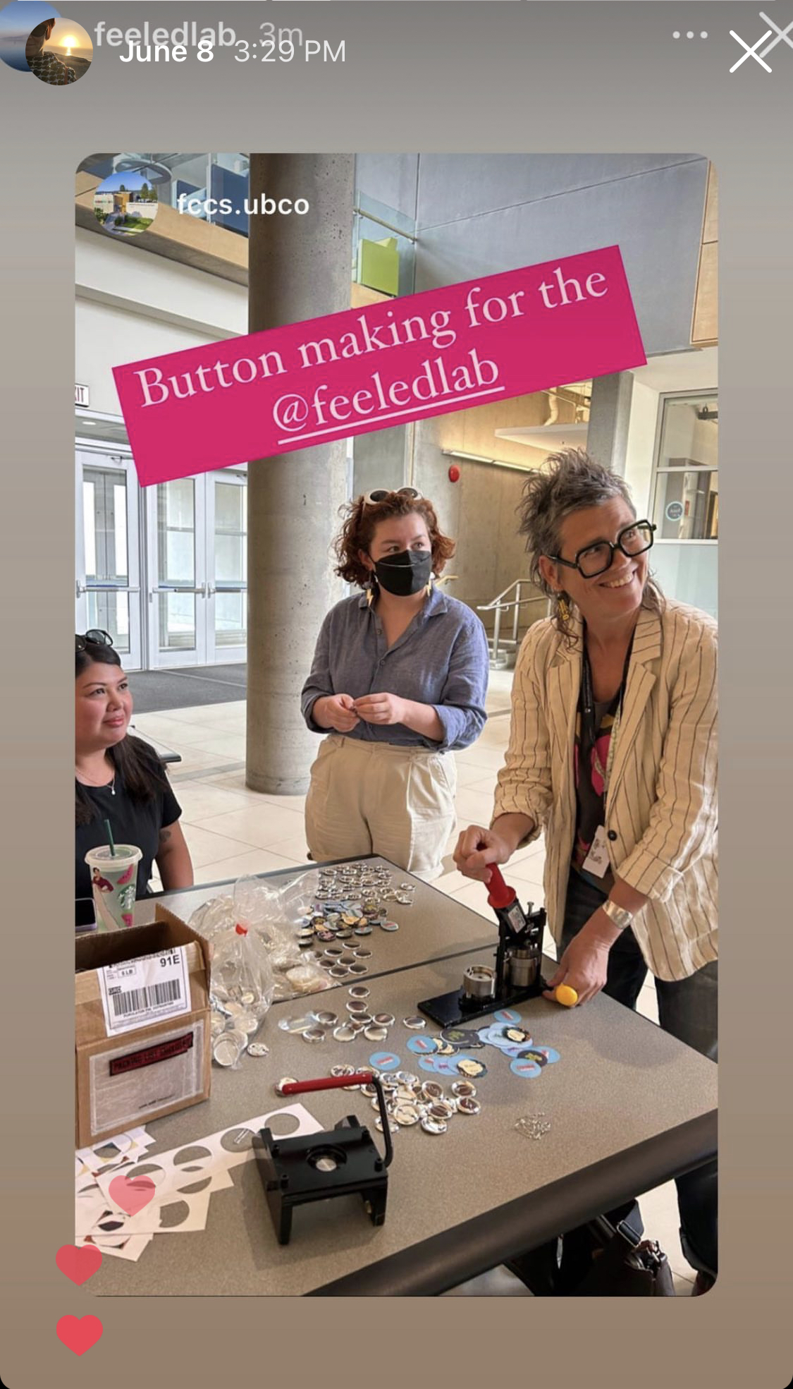 Getting ready for Water + Fire, we had a second session down at the Lab in May to sew some tote bags and make a few more patches, and once again on campus in June, in collaboration with the AMP Lab to make buttons (or badges, as some call them). Buttons are so fun to wear and to gift to people! (What hands have put these pieces together, as they hurtle down an assembly line in a country that is not this one? More questions.) Craft-a-strophe, after all, is not just about crafting and poetry; it also happens in the context of multiple intersecting crises.