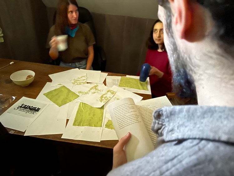 That takes care of the “craft” part – but what about the “strophe”? Some of you poetry nerds might know that “strophe” is another word for a group of lines in a lyric poem. Crafting + strophe = a chance to do things with our hands, while reading or thinking about poetry. Given FEELed Lab Visiting Researcher Rebecca Macklin’s interest in extraction poetics, our first craft-a-strophe session in April featured a number of poems chosen by Rebecca, to open up space to think about what lives and dies in the shadow of extraction, together (which was also a good primer for our upcoming Tar Sands field trip). Numerous friends of the FEELed Lab joined us to make silk screen patches, t-shirts, hats, and cyanotype cards as well.