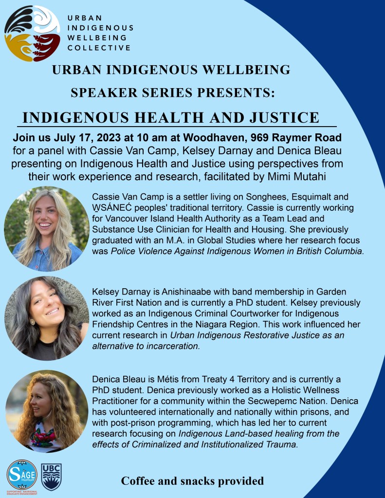 The Urban Indigenous Wellbeing Collective presents its first event as a part of the Speaker Series on July 17, 2023, at 10 am at Woodhaven. The Urban Indigenous Wellbeing Collective is committed to building an innovative research, training, and mentorship community that is centred on the wellbeing of urban Indigenous communities. Honouring Indigenous connection to the land this panel will be held outside and brings together Cassie Van Camp, Kelsey Darnay and Denica Bleau who will be presenting on Indigenous Health and Justice using perspectives from their work experience and research and facilitated by Mimi Mutahi. We invite anyone interested to come join us, with coffee and snacks being provided.