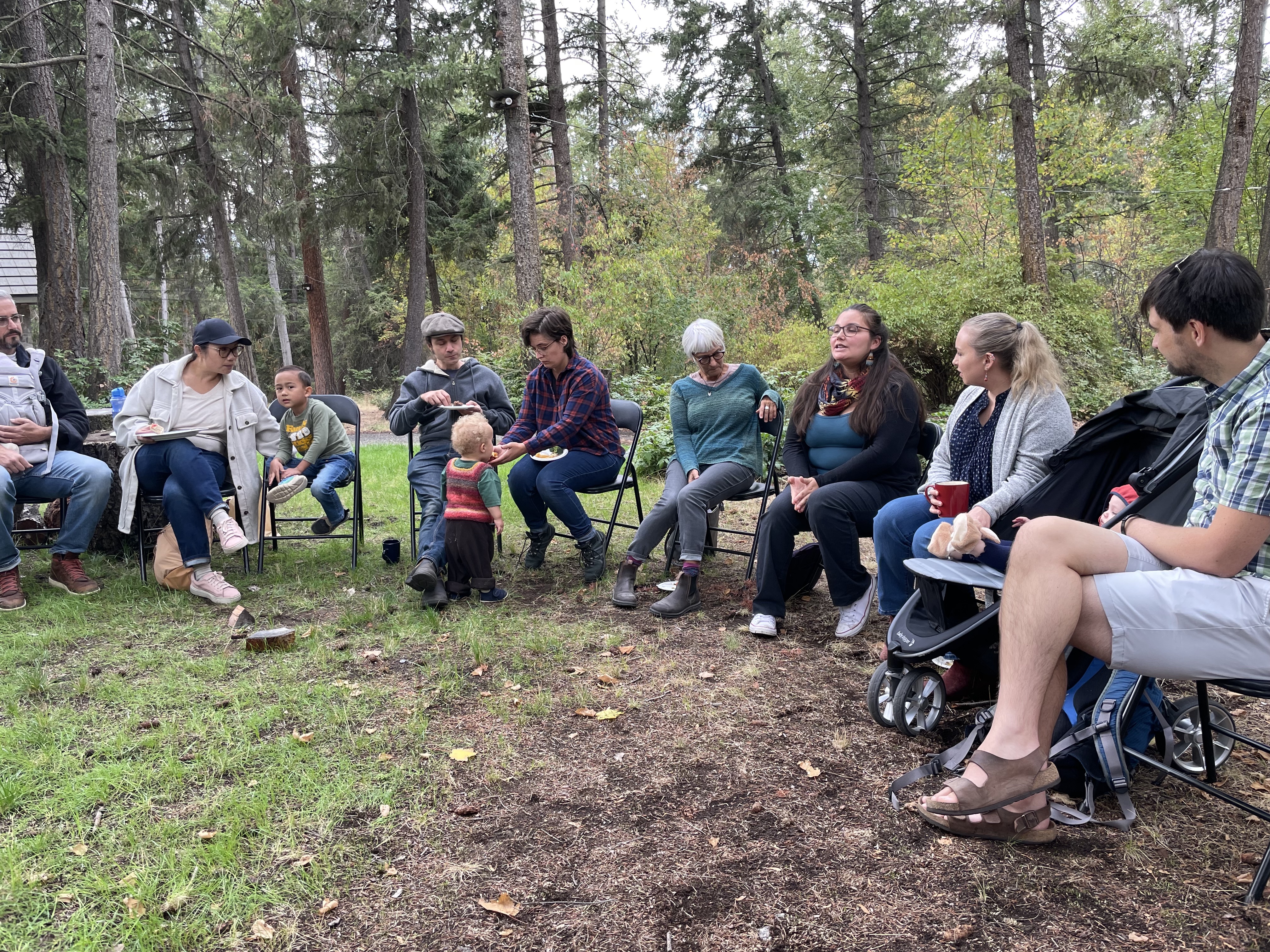 We were moreover delighted to help convene a family-oriented professional development day for staff and faculty of UBCO’s Department of Community, Culture and Global Studies last month, where Hailey Causton, 4th year student in the UBCO Bachelors of Nsyilxcn Language Fluency Degree, gave us an amazing language lesson! Learning some words and phrases beneath the towering trees, with birds and chipmunks adding their two cents, was an incredible experience.
