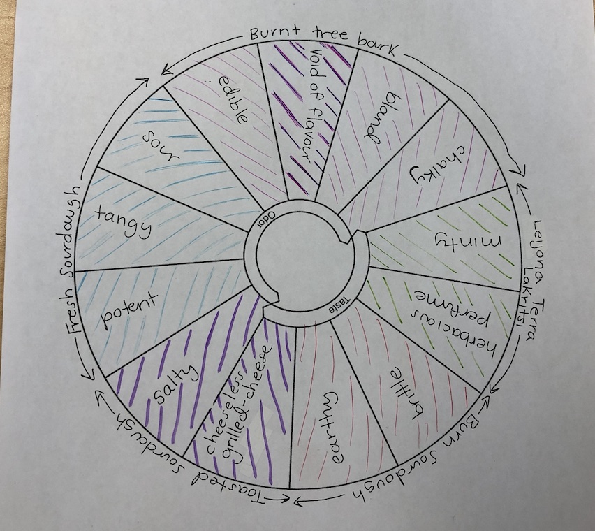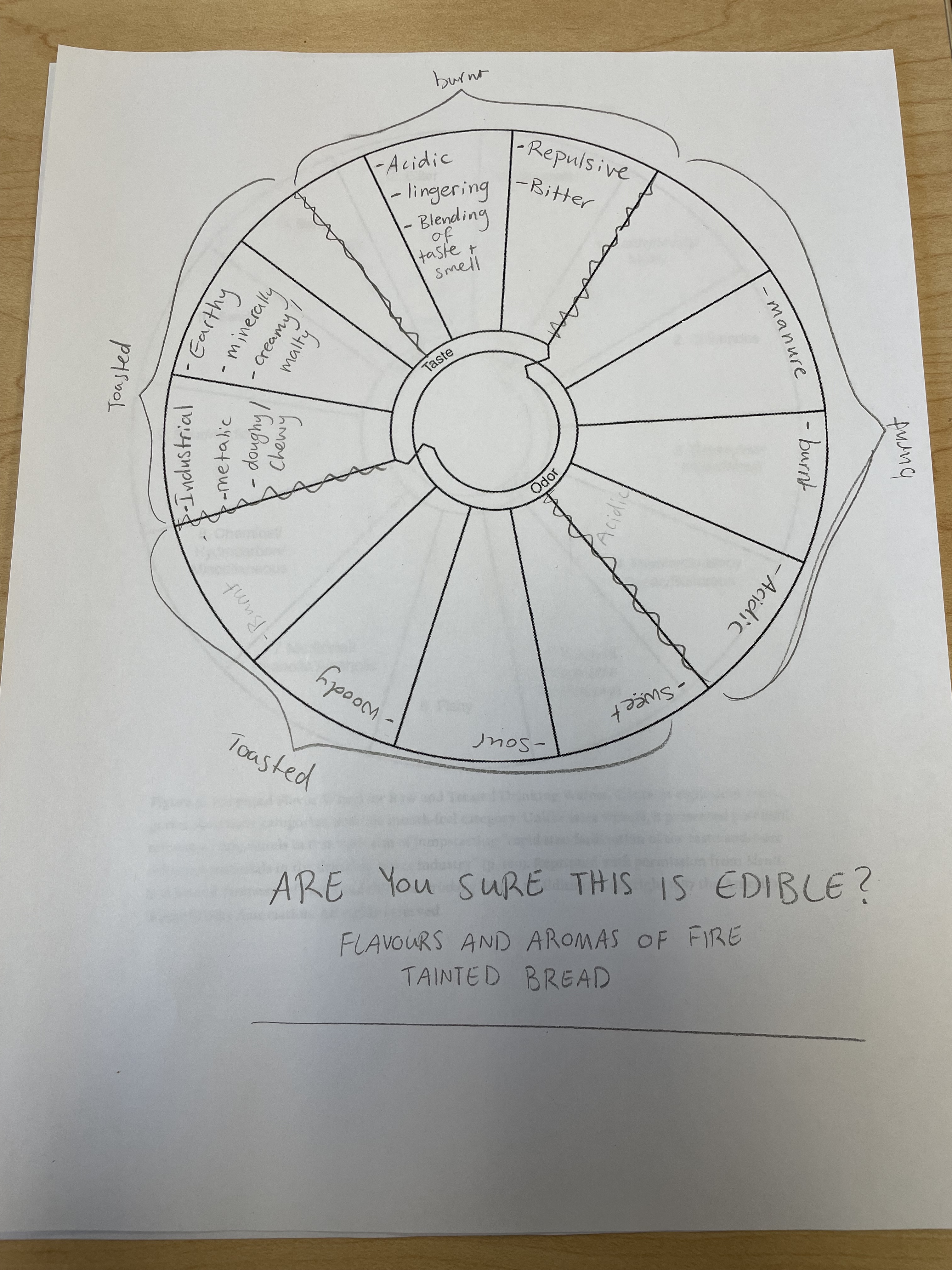In response to Lindsay’s provocations, students created a number of bespoke taste wheels. This exercise helped them pay close attention to the ways their bodies (taste buds, olfactory processes, memory, affect) could be called on, in a more-or-less rigorous methodological way, to understand place and planetary processes such as wildfire.