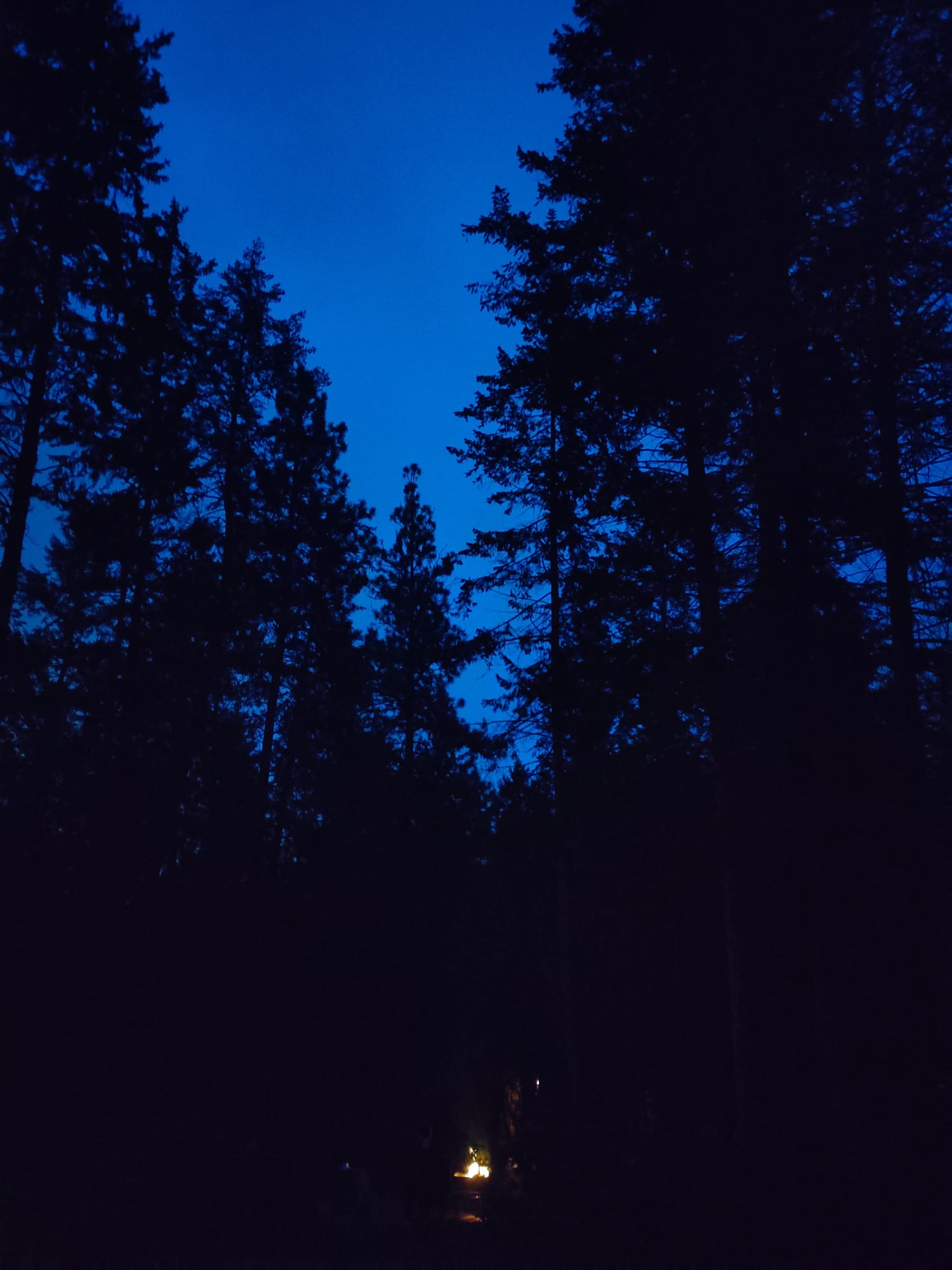 Although in some ways this gathering could be just a simple social event, there is something important about rethinking our relationship to darkness, in the night, at the edge of a forest, around a fire – and (as always) on stolen and unceded syilx lands. How is darkness part of these places, and part of us, in ways we may rarely contemplate? How might offering these stories to others — folx we may barely know or are meeting for the first time — also be a way of practicing vulnerability in the dark, and offering shelter to others, though our smiles and our snaps? What is here that we don’t, or can’t, or find difficult, see? What does darkness allow us to see, differently?