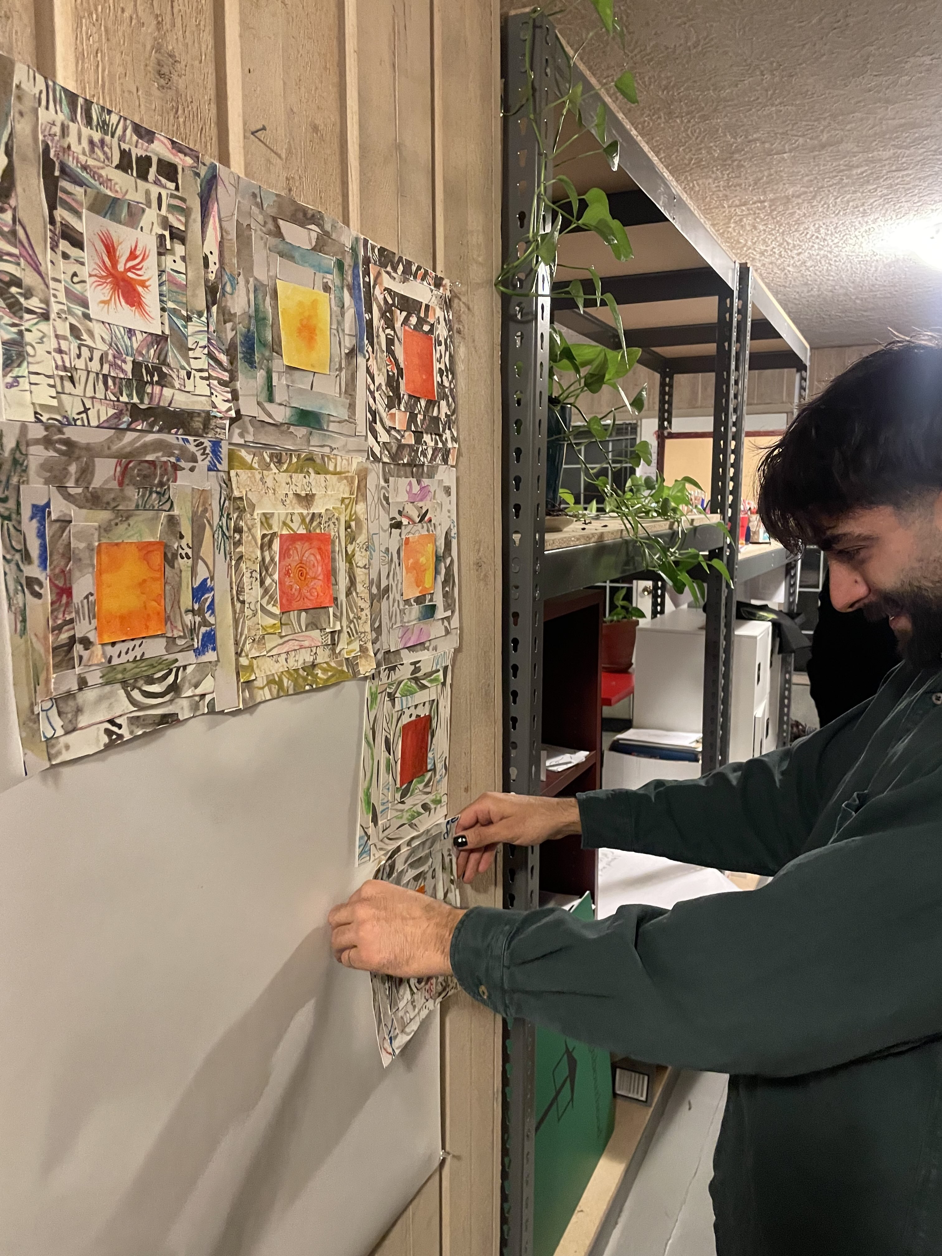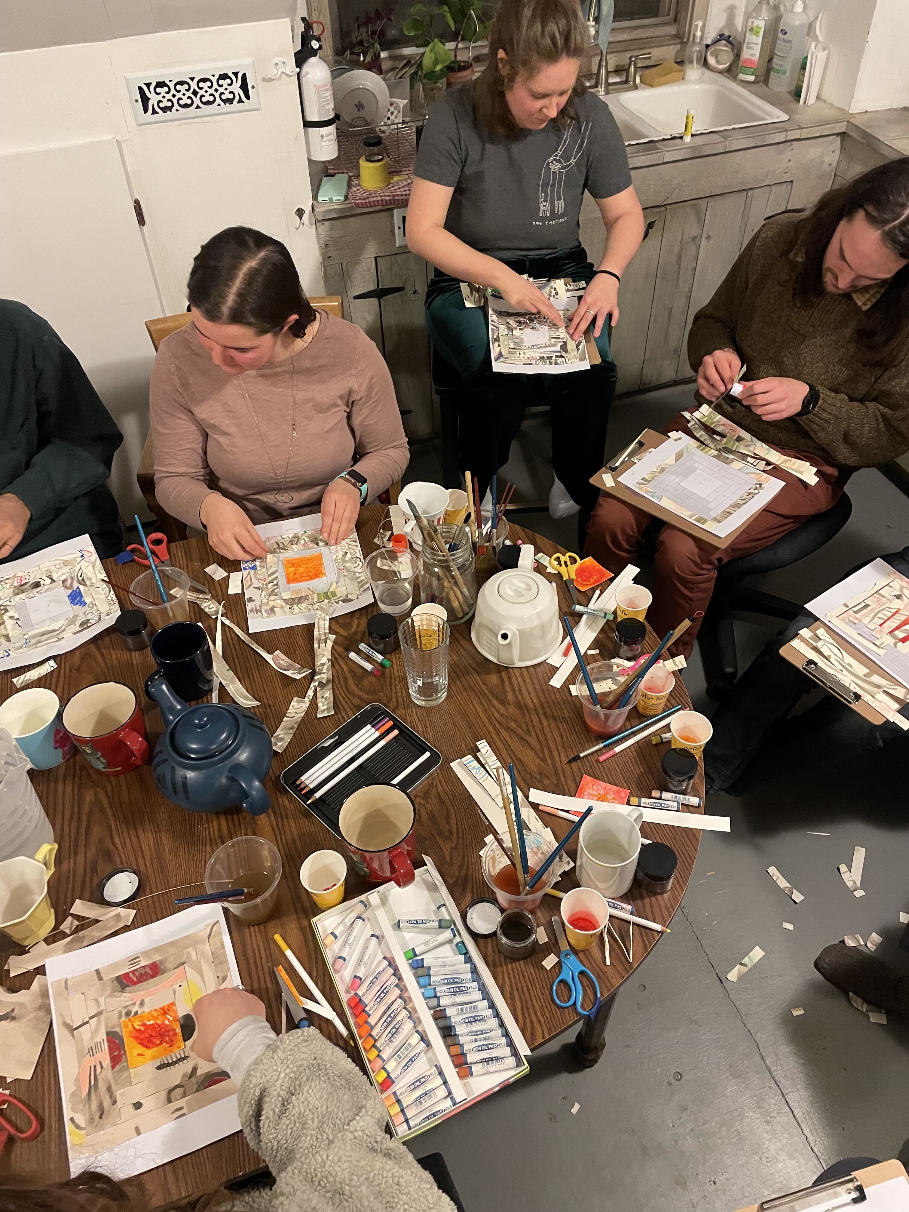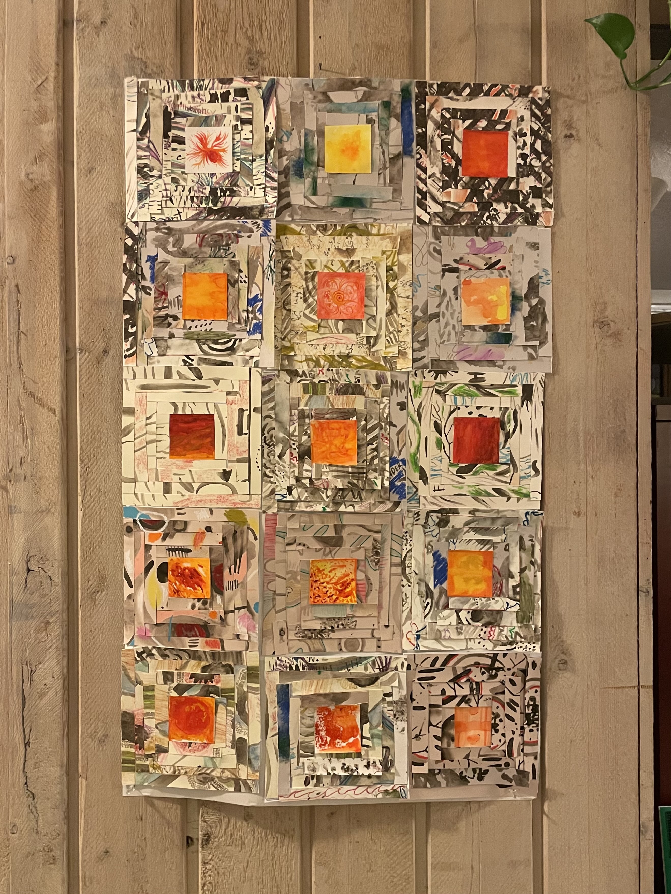 In the workshop, I invited participants to engage with materials, visualize their emotions about climate change, and introduce color into their compositions as we reflected on the strength of community support on working through these feelings together. We cut up and collaged our paintings, transforming them into paper quilt squares. We followed the traditional “Log Cabin” pattern, where a red square center represents the hearth of a home. We talked about the symbolism of interlocking rectangles in the quilt pattern—how they visually echo community support.