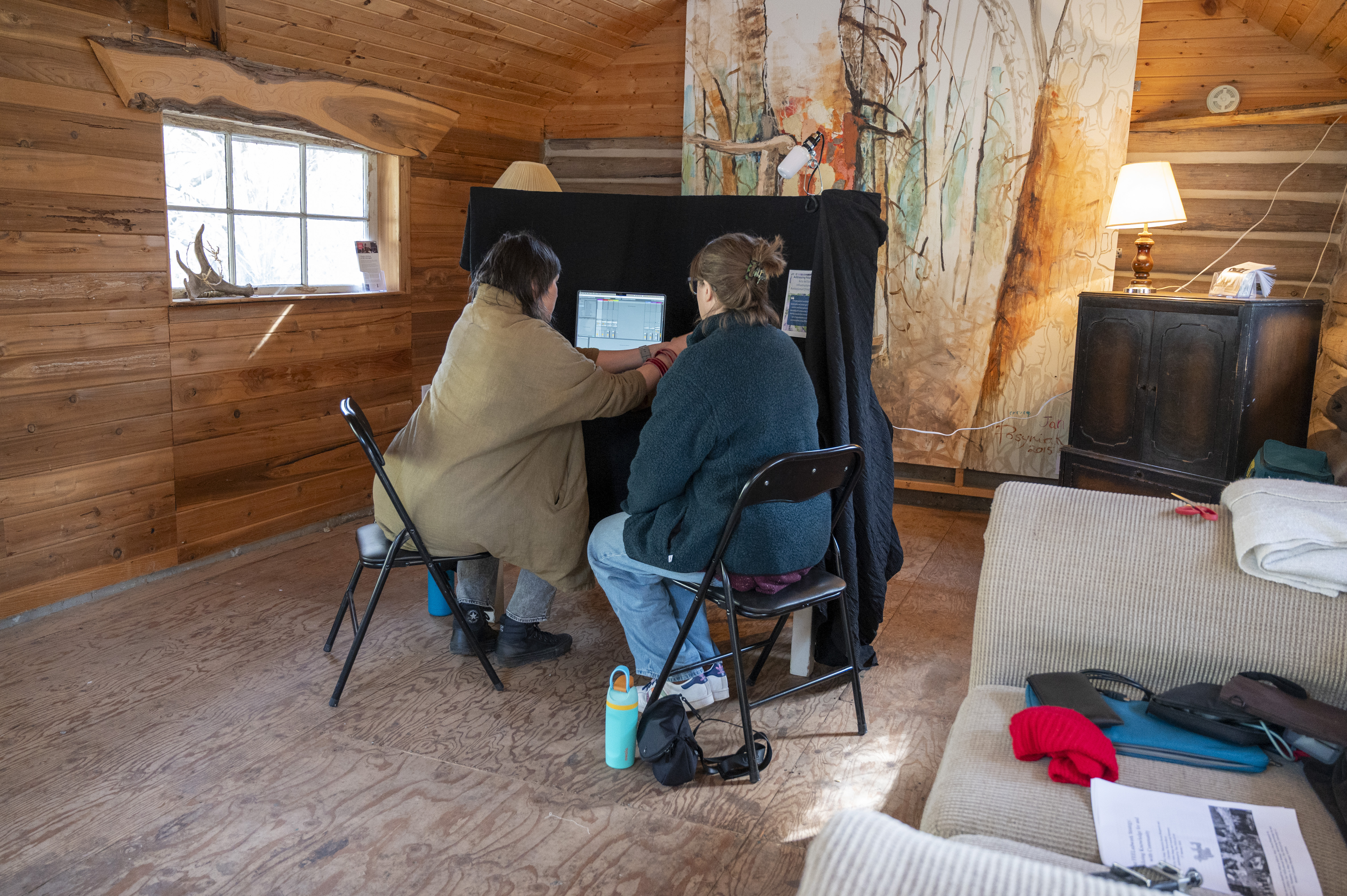 Two of our climate solutions scholars, Estraven and Jamie, who are working on addressing polarization through arts‐led social infrastructures set up a podcasting booth in the schoolhouse. Their podcast “Otherwise: Polarized” is currently in production – stay tuned!