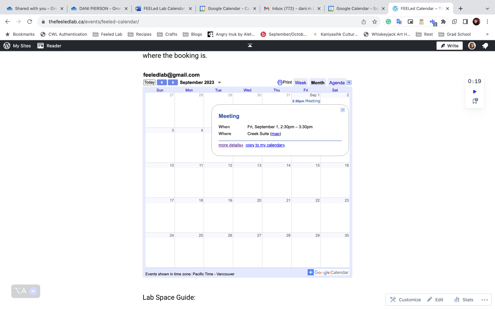 The FEELed Lab has a shared and public calendar to inform Lab users what is happening at the Lab. The calendar is viewable on our website here, (hover over “Gatherings” -> select “FEELed Calendar”). Our intention is for FEELed Lab members utilizing Lab spaces for events, meetings, and gatherings to add these to our calendar themselves. Please always book a space you are intending to use, as they can be booked at any time if they are available on our calendar.