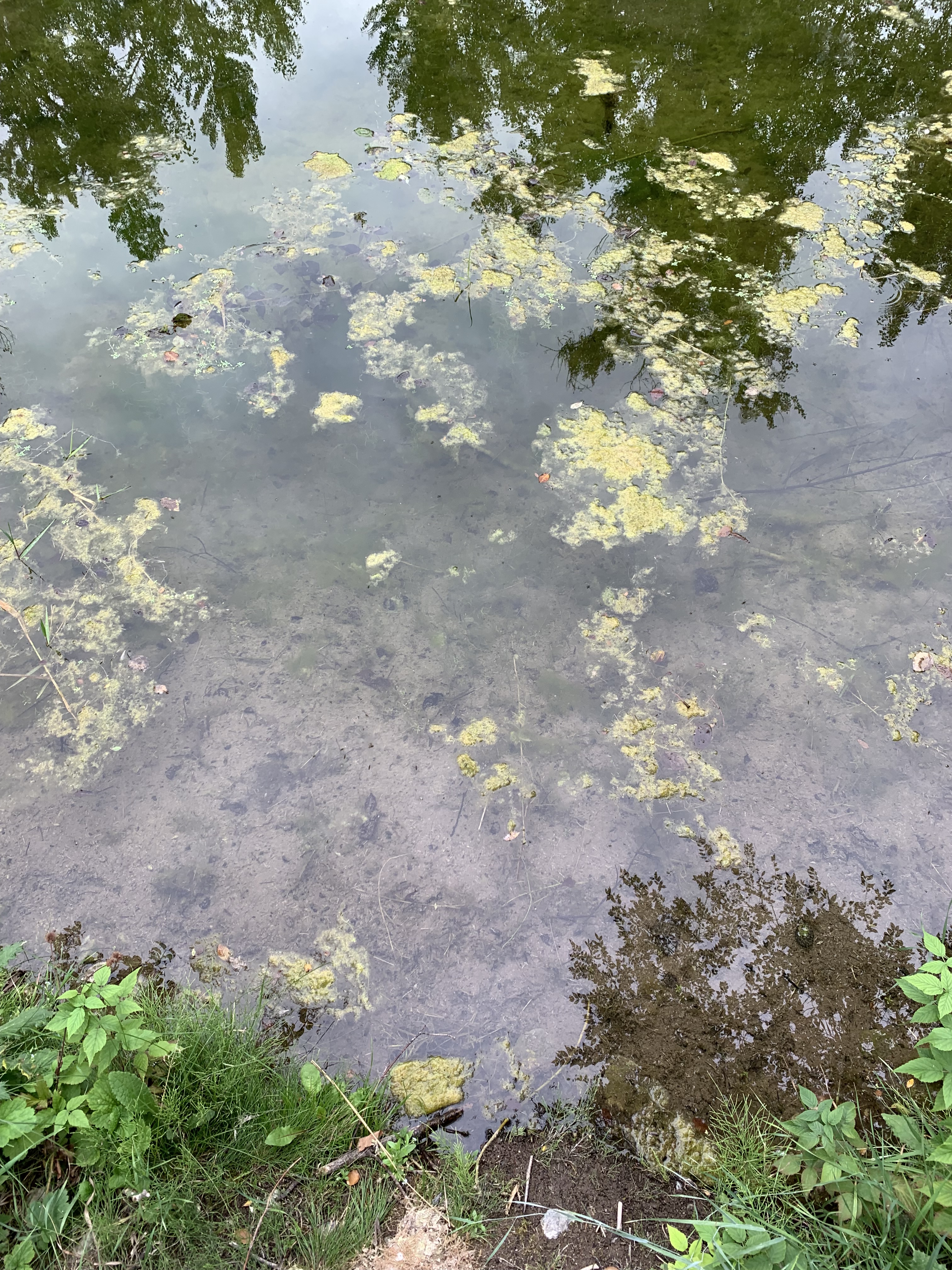 A body of water with algae floating on top. There is twigs, plants, and rocky sand under the water. The top of image has leafy trees reflected in the water. The bottom of the photo shows the bank with grass and leafy plants.