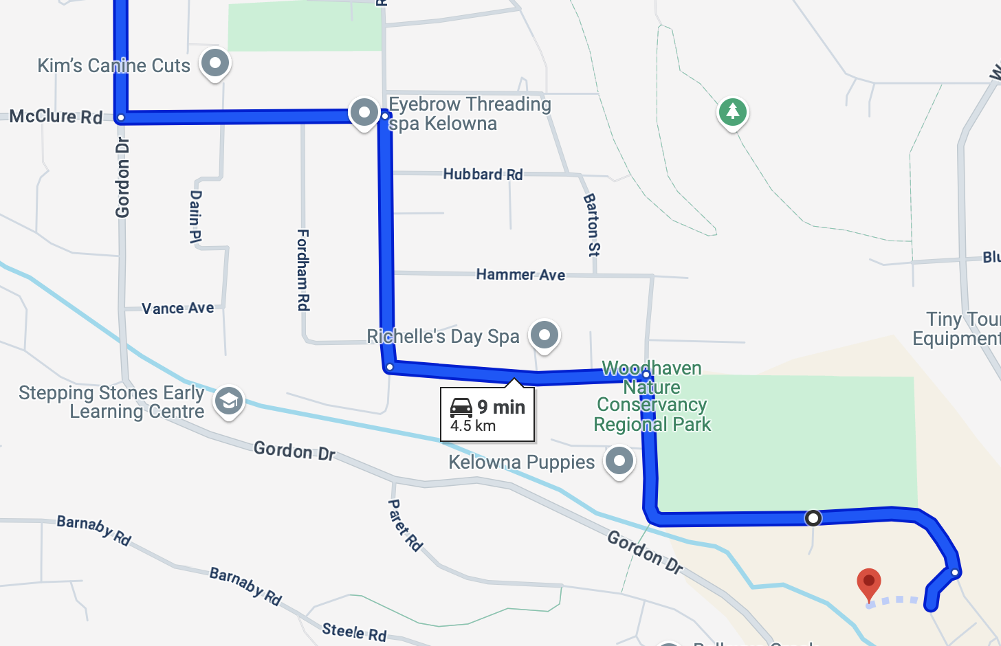 If you wish to travel by bus, BC transit route 17 begins at H2O Centre and drives south. The stop closest to Woodhaven is 870 Block Gordon Drive, from which you can access a wooden bridge over Bellevue Creek that exits onto Raymer Road approximately 200m west from its end, where the aforementioned path begins. In total, the walk from the bus stop to the Ecocultural Centre is approximately 500m.